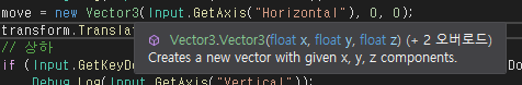 -> Vector3(x좌표, y좌표, z좌표) : 이 Vector3는 기본적으로 값을 3개 갖는데 그 각각의 값이 x, y, z좌표이다. 그래서 Input.GetAxis("Horizontal")을 x좌표가 들어갈 자리에 넣어주고 있다. 이렇게 하면 키보드 입력에 따라 GetAxis를 통해서 값을 받아오고 move에 계속 대입하게 된다.