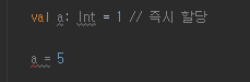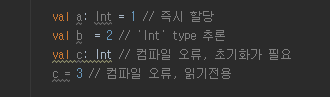 일단, 위의 구문을 보면 Val로 c라는 변수가 자바에서 final과 같은 것임을 선언했다.